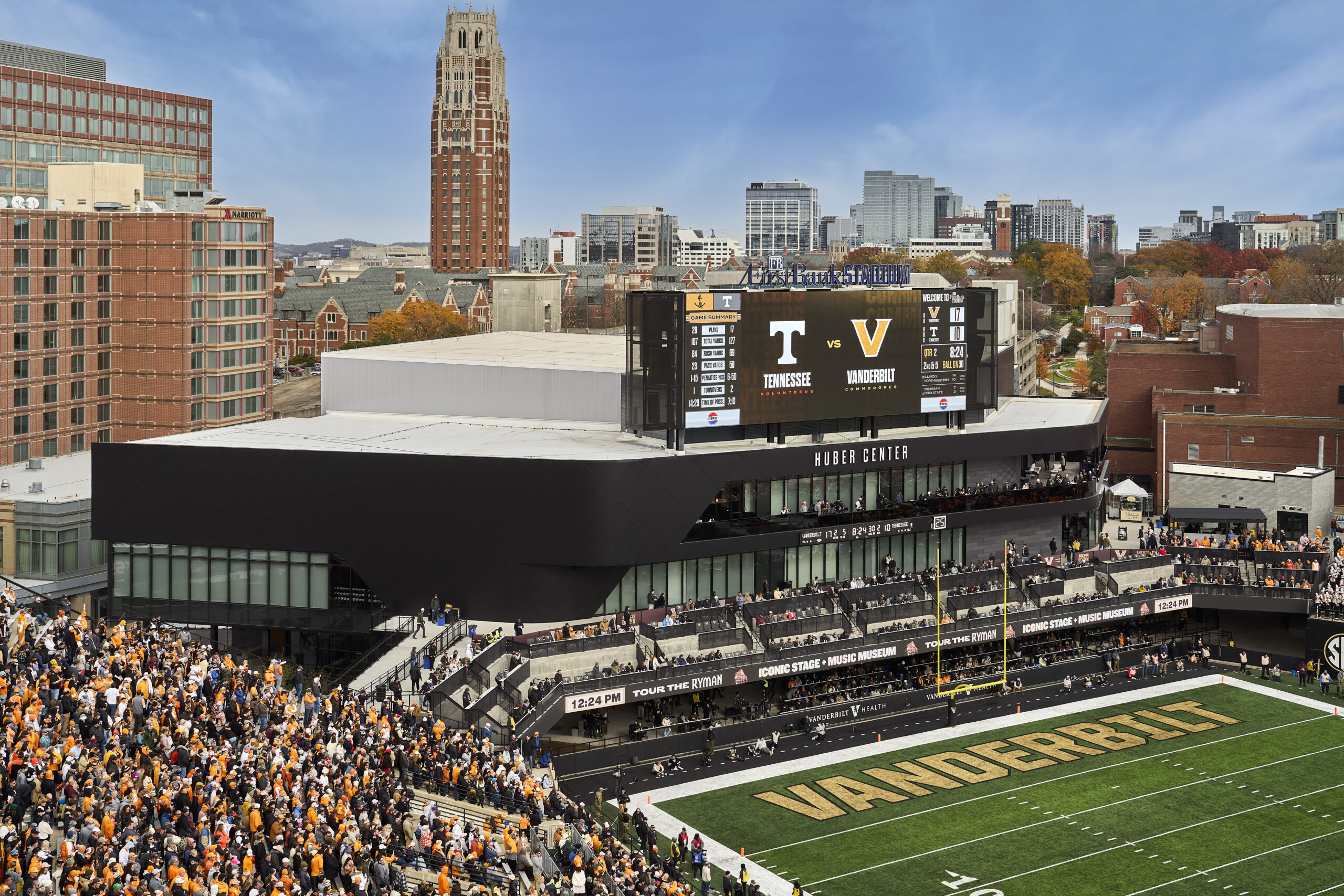 Construction concluded on the north end zone project at FirstBank Stadium, home to the Vanderbilt University football program, before the 2024 football season began. The new end zone features premium hospitality areas, a videoboard to enhance game day experience, premium seating and loge boxes for games, a visiting team locker room, and concourse expansion connecting FirstBank Stadium’s east and west concourses. The project was the exterior façade of the new basketball operations center, which opened in late 2025.